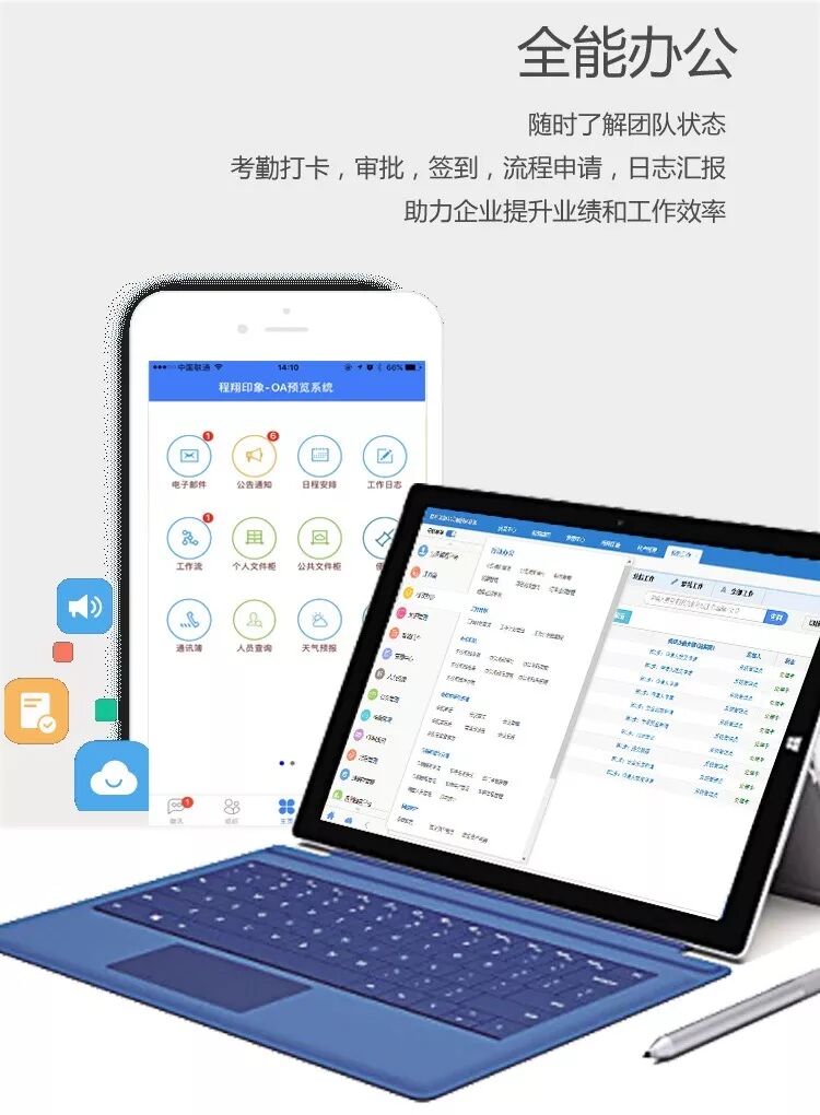 功 能: 界面自定义/发布通知公告/移动办公 随时随地展开工作/员工联系高效沟通/工作成果、申请等快速审批/考勤管理绩效审核……等全面多样、随时延展的组织协同管理功能。