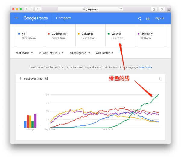 这里列几个客观的数据(截止至 2017 年 1 月 2 日): 一、Github 上 PHP 项目排行第一 Laravel 作为这一页里最晚出现的框架,Star 数量远远高于排名第二的框架。链接在此 Build software better, together 二、Google 趋势排第一 Laravel 跟其他框架的对比图,链接在这里 https://www.google.com/trends/explore?date=2006-08-16 2016-09-16 三、用户投票排名第一 编程网站 Sitepoint 上的用户调查第一名,链接: The Best PHP Framework for 2015: SitePoint Survey Results Laravel 在国内的生态圈发展也日趋成熟,你可以很轻松的在网上找到很多 Laravel 相关的中文学习资料、技术讨论社区等。 |
