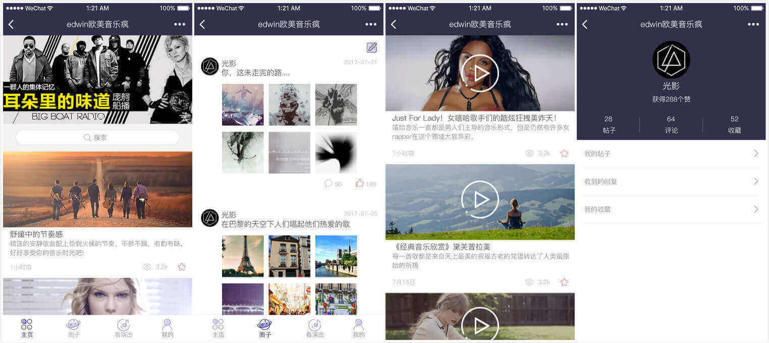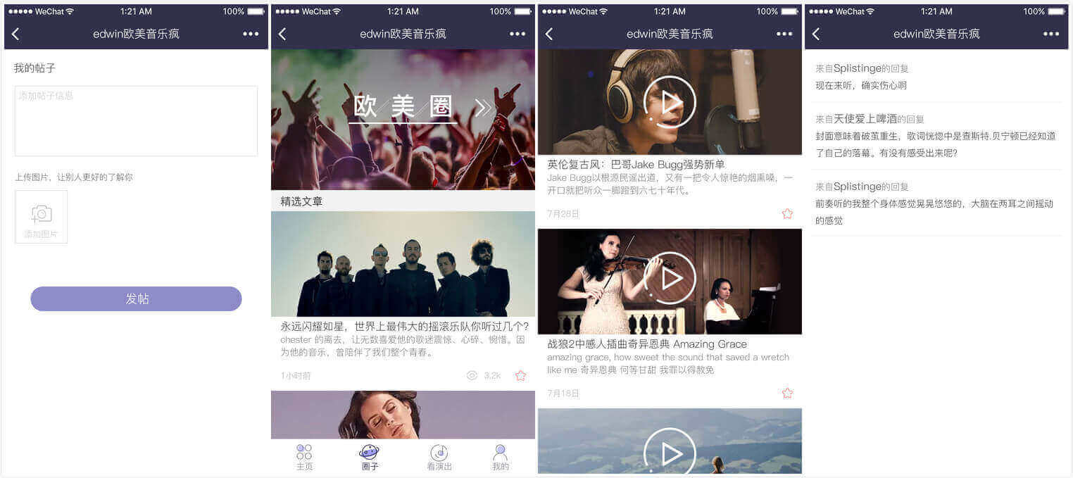 “欧美娱乐”是为微博知名音乐大v 《欧美音乐疯》设计的一款音乐为主,用户可实现在线交流,分享欧美流行音乐的小程序。整个项目设计的我们采用了欧美风格,并且开发了功能强大的管理后台,可以实现图片裁剪,视频压缩等功能