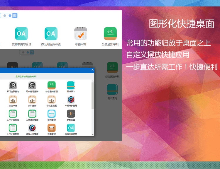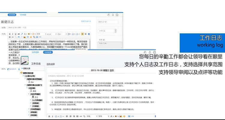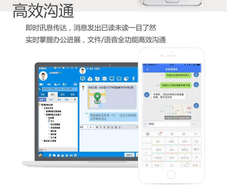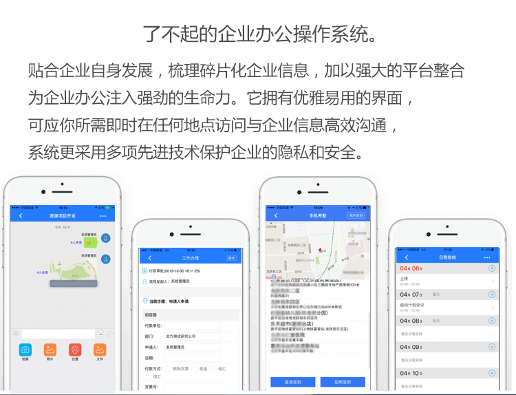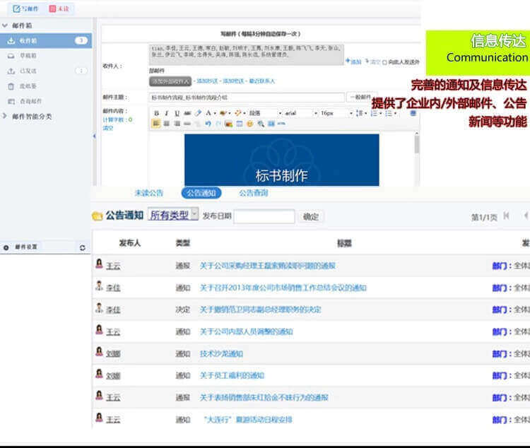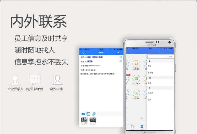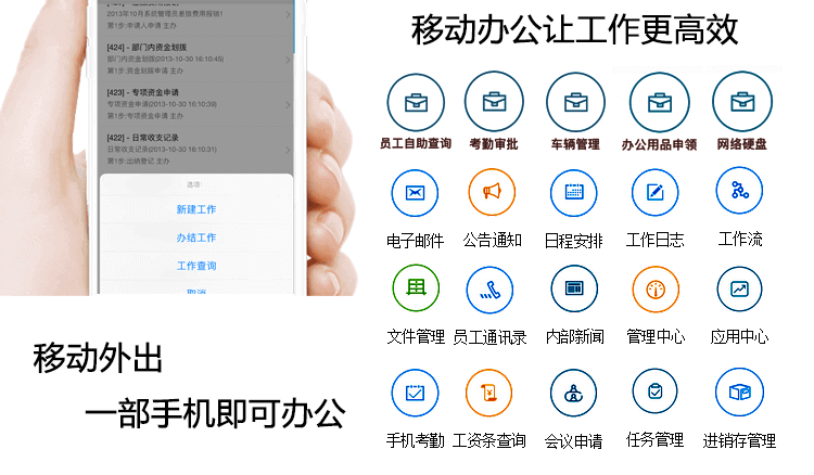 功 能: 界面自定义/发布通知公告/移动办公 随时随地展开工作/员工联系高效沟通/工作成果、申请等快速审批/考勤管理绩效审核……等全面多样、随时延展的组织协同管理功能。